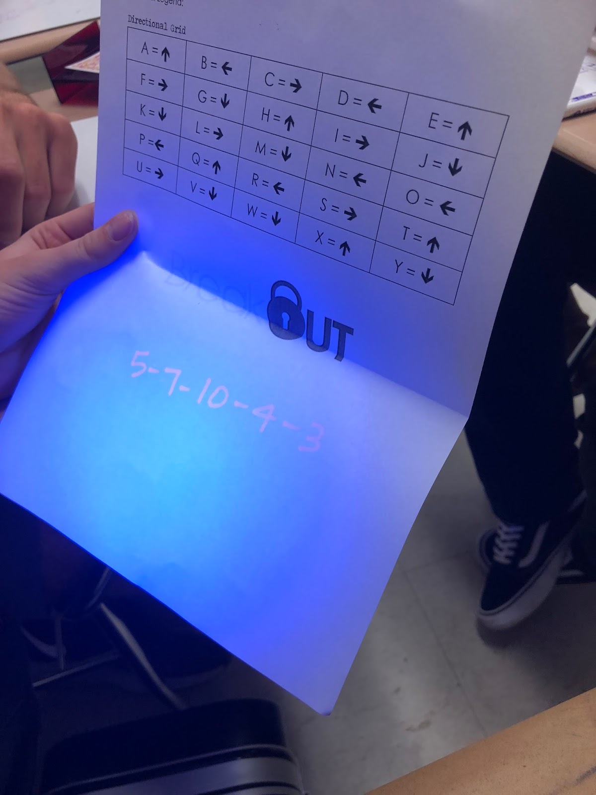 The big box contains two smaller boxes, multiple choice questions, a directional key (that goes with the questions), and a blacklight. There are 10 multiple choice questions but students only have to answer 5. These are indicated by circling certain numbers with the invisible ink pen. (Most students start by answering every question, and finally realize that they need to use the blacklight.) The answers correspond to the letters which correlate with the directional (arrow) key. The order is written in invisible ink on the back. This will unlock one of the small boxes. This small box contains another group of questions. The letters spell out CANDY which will unlock the next small box. This box contains a key and a picture of a locker with the locker number.